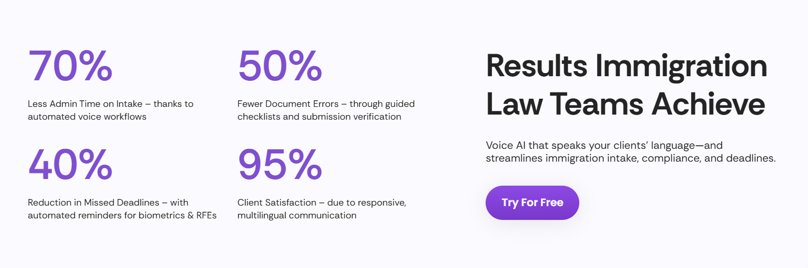 - Immigration-trained AI using call recordings and practice-specific terminology
