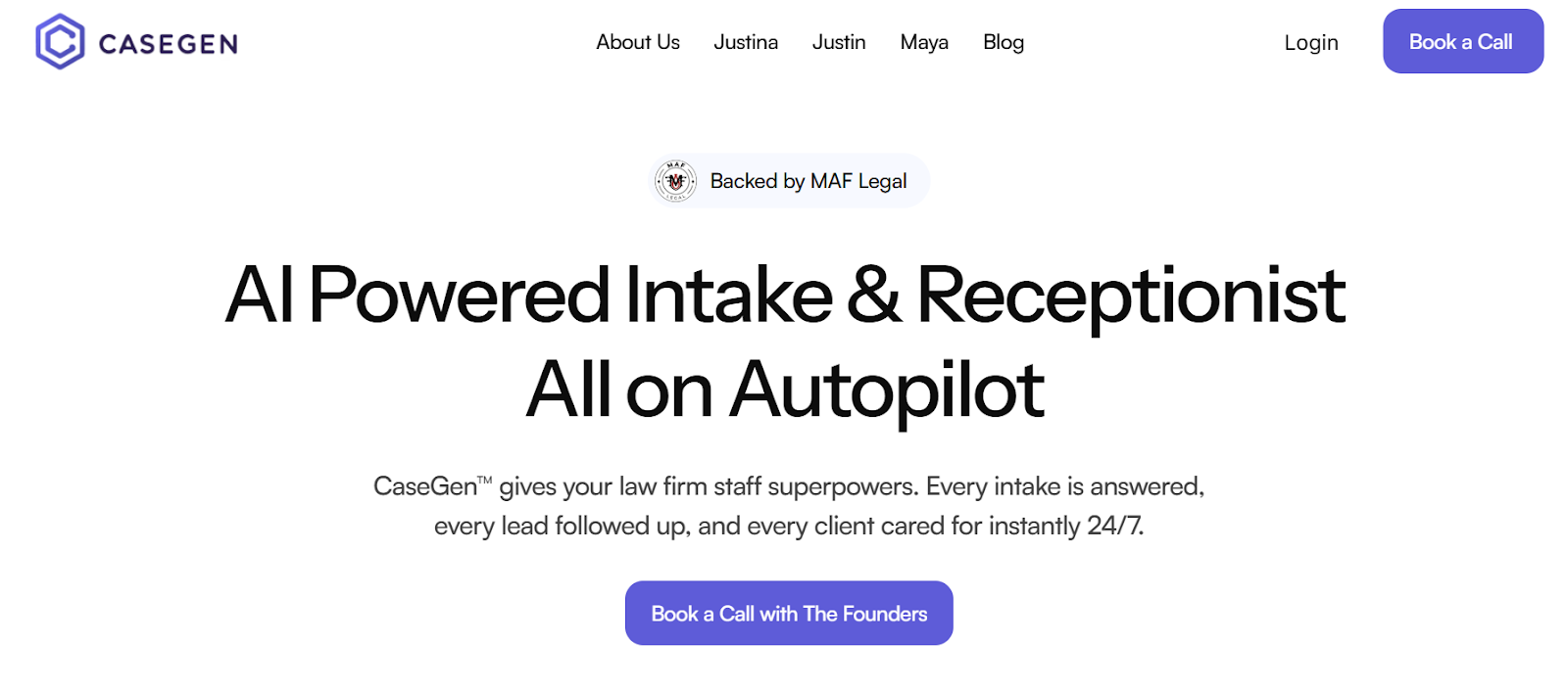 - CaseGen.ai runs on three AI agents that handle the main legal tasks — intake, follow-ups, and medical coordination. Justina – The Intake Manager, Justin – The Outreach Agent, and Maya – The Medical Coordinator