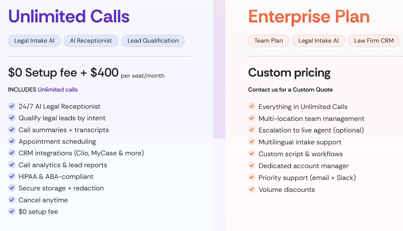 Every plan includes 24/7 live AI reception, multilingual intake, CRM integrations, and full compliance coverage. You can sign up, complete onboarding in minutes, and start capturing client calls the same day.